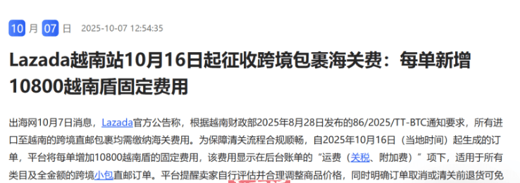 Lazada官方公告稱,根據越南財政部發布的通知要求,所有進口至越南的跨境直郵包裹均需繳納海關費用。為保障清關流程合規順暢,自2025年10月16日(當地時間)起生成的訂單,平臺將每單增加10800越南盾的固定費用,該費用顯示在后臺賬單的“運費(關稅、附加費)”項下,適用于所有類目及全金額的跨境小包直郵訂單。